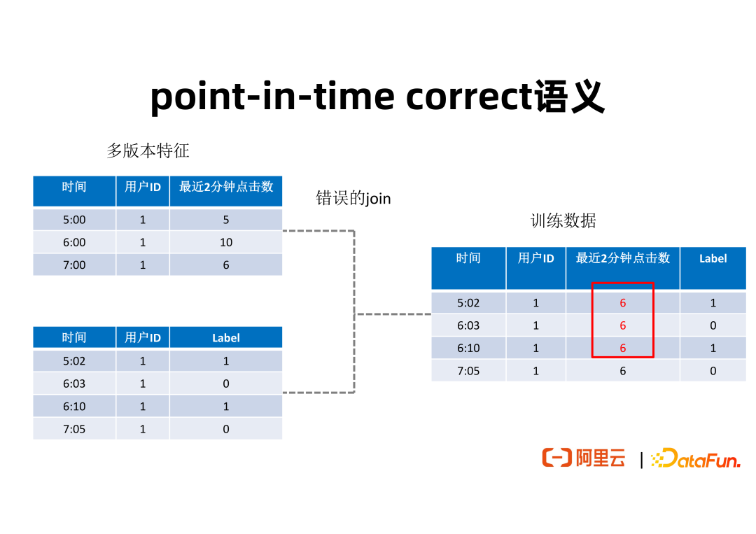 为了让大家能够理解什么叫特征穿越,上图给出了一个简单例子,来展现这个问题。图左上表是用户的一个行为特征,表达了在不同时间节点,对于一个给定 ID 的用户,在最近两分钟内的点击数。这个点击数可能帮助我们推理用户是否会点击某个广告。为了用这些特征去做训练,通常需要将特征拼接到用户带有 Label 的一些数据集上。图左下表展现的是一个用户实际有没有点击广告的一些正样本和负样本的数据集,标注了在不同的时间点,用户所产生的正样本或负样本。为了将这两个数据集中的特征拼接起来,形成训练用的数据集,通常需要根据用户 ID 作为 key 进行特征拼接。如果只是简单地进行 Table Join,不考虑时间戳,就可能产生特征穿越问题。 例如在 6:03 分时,用户最近 2 分钟点击数应该是 10,但拼接得到的特征值可能是来自 7:00 分时的 6。这种特征穿越会带来实际推理效果的下降。一个具有 point-in-time correct 语义的 Join 结果应该如下图所示: