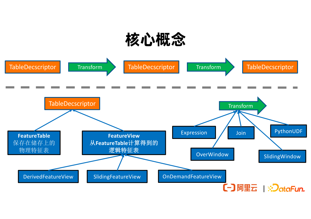 TableDescriptor 分为两类。其中 FeatureTable 表达的是具有特定物理地址的表,例如可以是一个在 Redis 中的表,也可以是一个在 HDFS 中的表。FeatureView 则是一些不一定有物理地址的逻辑表,通常是从一个 FeatureTable 经过一连逻辑串转换后得到的。