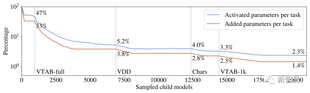 每个任务激活的和增加的参数占多任务系统参数总数的百分比