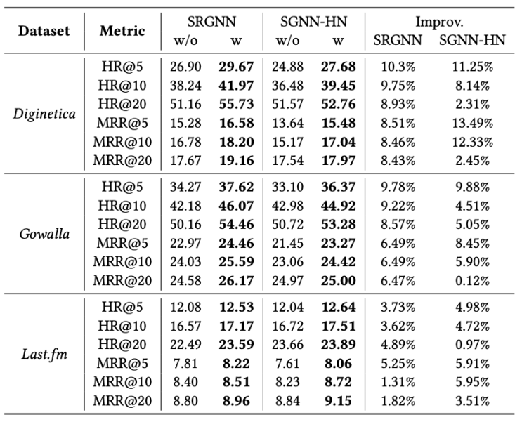 此外,作者还将 Atten-Mixer 模块嵌入到 SR-GNN 和 SGNN-HN 中,以验证该方法对原始模型的性能提升作用。