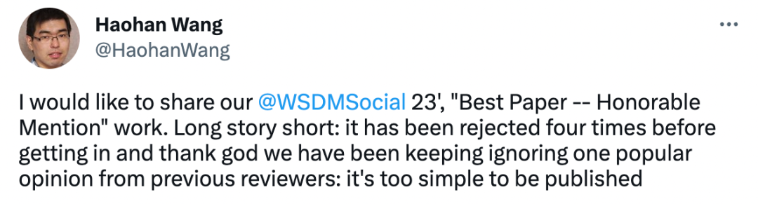 最后,值得一提的是,这篇文章在获得 WSDM2023 最佳论文荣誉提名的背后还有一段曲折的开发经历,如文章作者之一来自 UIUC 的 Haohan Wang 介绍的那样,这篇文章其实先后因为太过简单而在投稿过程中拒绝过多次,值得庆幸的是,文章的作者并没有为了中文章而去迎合审稿人的口味,而是坚持了自己简单的方法,并最终让这篇文章获得了荣誉。