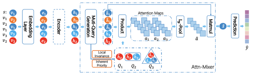 其中 Q1 是 instance-view attention query,而其他的则是更高级别的 attention query,具有不同的感受野和局部不变信息。接下来,模型使用生成的 attention queries 来 attend 该 session 中每个 item 的 hidden state,并获得最终的 session representation。