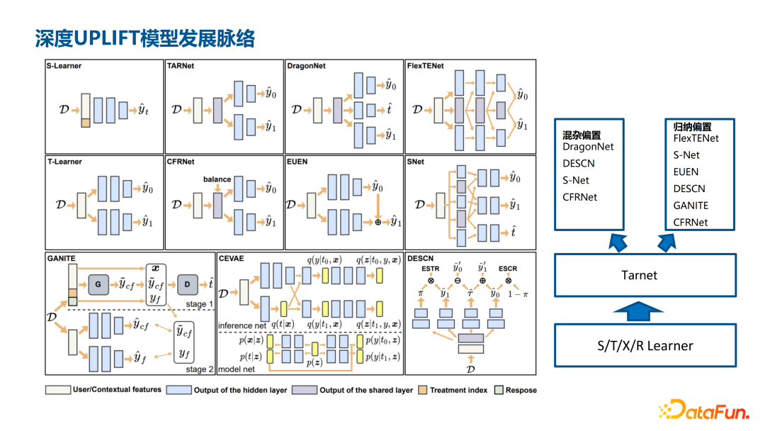 首先最基本的是 Meta-Learner,代表的建模方案有 S-Learner 和 T-Learner,随后进入深度学习后就演化出来以解决混杂偏置为代表的 DragonNet、DESCN、S-Net、CFRNet 等,和以解决归纳偏置为代表的 FlexTENet、S-Net、EUEN、DESCN、GANITE、CFRNet 等。