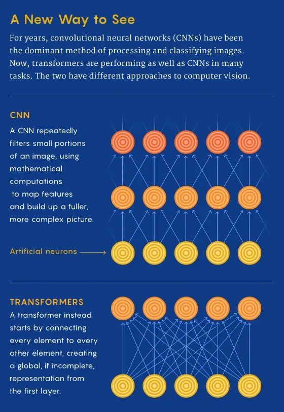 在CNN中,我们从局部开始,逐渐获得全局视角。CNN通过从局部到全局的方式构建特征,逐像素识别图像,以识别例如角落或线条等特征。然而,在transformer中,通过自我注意力,即使在信息处理的第一层上,也会建立远程图像位置之间的连接(就像语言一样)。如果CNN的方法就像从单个像素开始缩放,那么transformer会逐渐将整个模糊的图像聚焦。