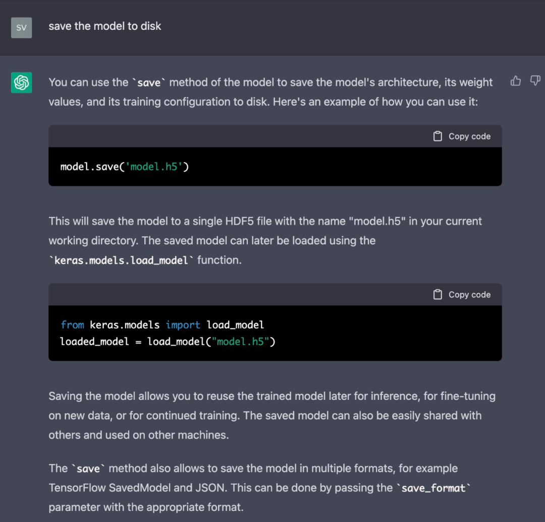 结果是满意的,最后就是准备部署这个模型了,让 ChatGPT 将模型保存到磁盘吧: