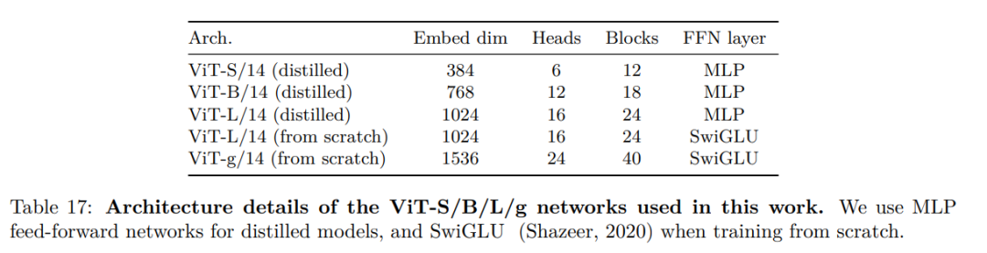他们考虑了几项改进,以在更大范围内训练模型。使用 PyTorch 2.0 在 A100 GPU 上训练模型,该代码也可与用于特征提取的预训练模型一起使用。模型的详细信息在附录表 17 中。在相同的硬件下,与 iBOT 实现相比,DINOv2 代码仅使用 1/3 的内存,运行速度提高到了前者的 2 倍。