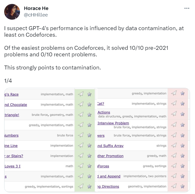 为了进一步证明这一假设,博客作者 Arvind Narayanan 和 Sayash Kapoor 在 2021 年不同时间的 Codeforces 问题上对 GPT-4 进行了测试,发现它可以解决 9 月 5 日之前的简单类别的问题,无法解决 9 月 12 日之后的问题。
