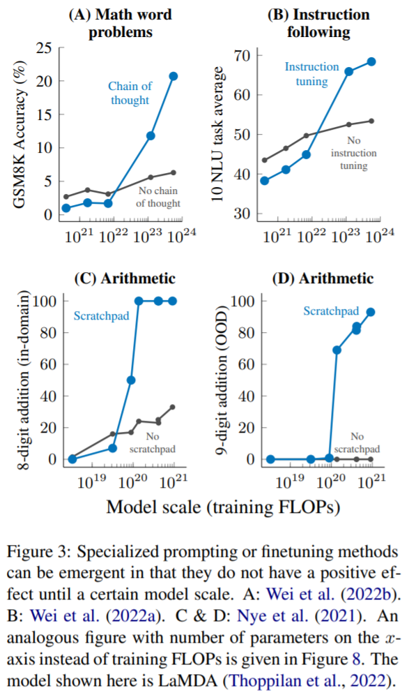 多步推理(Multi-step reasoning):对于语言模型和 NLP 模型来说,推理任务,尤其是那些涉及多步推理的任务一直是一个很大的挑战。最近有一种名为思维链(chain-of-thought)提示策略,通过引导语言模型在给出最终答案之前生成一系列中间步骤,从而使它们能够解决这类问题。如图 3A 所示,当扩展到 1023 次训练 FLOP(~ 100B 参数)时,思维链提示只超过了没有中间步骤的标准提示。