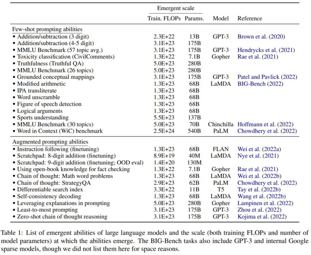 本文探讨了模型规模的突现,通过训练计算和模型参数来衡量。具体而言,本文将大型语言模型的突现能力定义为在小规模模型中不存在、但在大规模模型中存在的能力;因此,大型模型不能通过简单地推断小规模模型的性能改进来进行预测。该研究调查了在一系列先前工作中观察到的模型突现能力,并将它们进行分类:小样本提示和增强提示等设置。