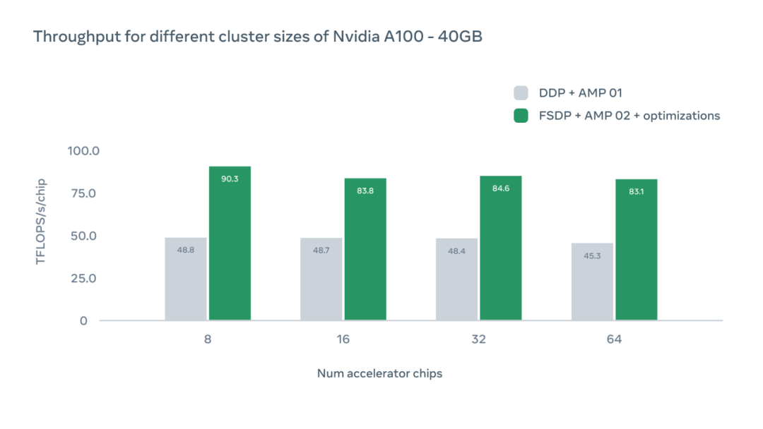 该研究还讨论了不同 GPU 配置的影响。在每种情况下,系统都实现了比分布式数据并行(DDP)基线水平更高的吞吐量。随着芯片数量的增加,由于设备间通信的开销,我们可以观察到吞吐量略有下降。然而,即使用 64 块 GPU,Meta 的系统也比 DDP 基准快 1.83 倍。