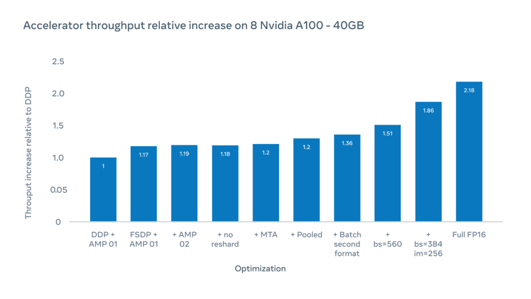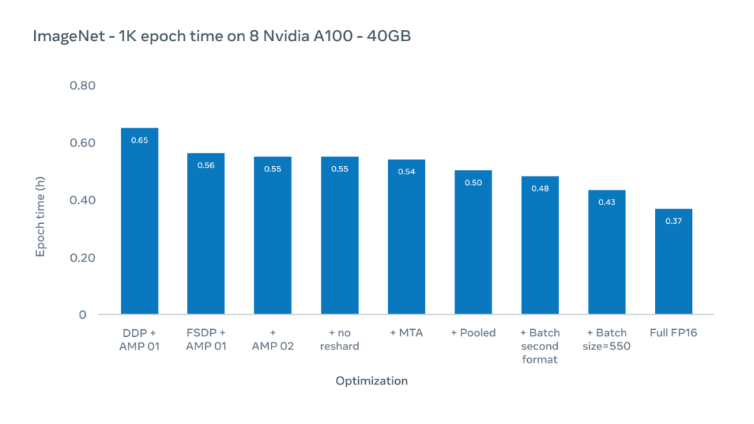Meta AI 的研究者使用优化方案,将 epoch 时间(在整个 ImageNet-1K 数据集上一次训练的持续时间)从 0.65 小时减少到 0.43 小时。