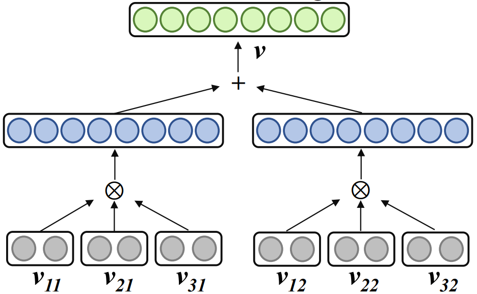 其中、r 为秩、n 为阶,表示张量积。Word2ket 只需要存储和使用这些低维的向量来构建高维的词向量,从而实现参数有效降低。例如,r =2、n=3时,一个维度为 512 的词向量,可以通过两组,每组三个维度为 8 低维向量张量积得到,此时所需参数量从 512 降低至 48。