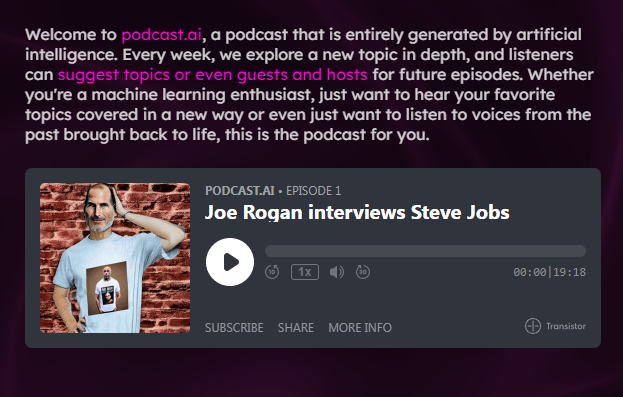 podcast.ai 是一个完全由 AI 生成的播客,每周都会深入探讨一个新话题。在第一期节目中,podcast.ai 通过乔布斯的传记和收集网络上关于他的所有录音,用 Play.ht 的语言模型大量训练,最终生成了这段假 Joe Rogan 采访乔布斯的播客内容。