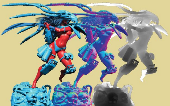 也可以使用灯光和阴影绘制更多颜色到最终模型中,轻色调适合用暖色调,你会发现阴影适合采用冷颜色,实验并找到适合自己的风格。合成的时候,可以单独处理渲染,以便进行更好的控制,可能会涉及经典颜色渲染、法线贴图和深度pass。