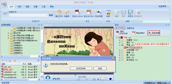 将本地的flash文件导入到闪客精灵中,在预览区可以看到播放效果,在右侧的导出面板,可以看到这个flash文件中的所有元素,其中就包括"声音"这一项。