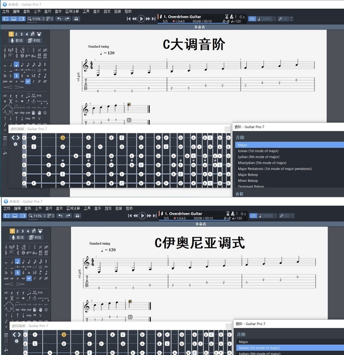 图片4:Guitar Pro上C大调音阶与C伊奥尼亚音阶对比