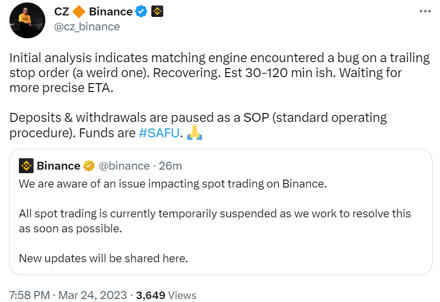CZ:预计需要30-120分钟左右恢复,资金是安全的巴适游戏网• 2025-09-25 06:11:53•链百科•阅读 1218 注册下载,立即领取价值高达60,000元数字货币盲盒 3月24日消息,币安创始人CZ发推称:“初步分析表明匹配引擎在追踪止损订单上遇到了一个错误(一个奇怪的错误)。正在恢复。估计 30-120 分钟左右。等待更精确的预计到达时间。作为 SOP(标准操作程序)暂停存款和取款。”资金是安全的。十几分钟前,币安现货交易出现问题。目前所有现货交易暂停,币安称正在努力尽快解决这个问题。抹茶安卓下载:立即前往抹茶IOS下载:立即前往2 标签: 火币打电话 - 火币打电话说注销 上一篇2025-09-25币圈交易平台app排名 usdt平台下载下一篇 2025-09-25相关推荐 Pi币登录指南:图文教程,防掉队!信息化时代,别掉队!Pi币登录全攻略2025-09-25 06:11:53816 币圈新手必读:涨跌规律与入门指南币圈新手入门指南2025-09-25 06:11:53833 AGRS发行总量多少?全面解析代币分配与价值AGRS 发行总量是多少?2025-09-25 06:11:53952 Peaq币2025价格预测:DePIN潜力爆发?Peaq (PEAQ) 2025年价格预测:未来发展如何?2025-09-25 06:11:531906 牛市顶峰Q4?比特币目标12万美元!Bitfinex 预测:今年第四季度见顶?2025-09-25 06:11:53952 CHZ币瑞士发行,欧洲杯或涨CHZ币概述2025-09-25 06:11:531438 幻藏是什么?蚂蚁链NFT平台深度解析数字藏品平台:幻藏(Magic Collection)2025-09-25 06:11:53508 2025虚拟币交易所Top10:安全平台终极指南2025年最安全的十大虚拟币交易所:你的理想交易平台在哪里?2025-09-25 06:11:531912