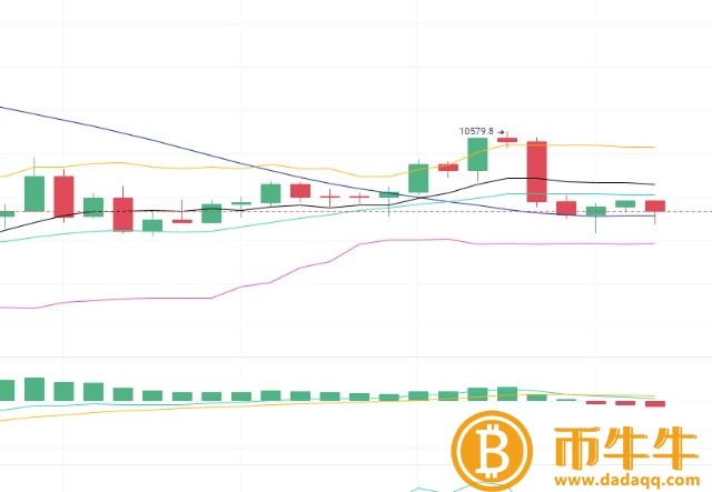 从四小时来看,BOLL由于昨晚的下跌,开口再次走平。价格已经跌破布林带中轨和MA10日均线,目前反弹力度不是很大。从斐波那契回撤线看,价格一直在23.6%附近运行。日内注意MA10日均线的比特币操盘压制。此外,我们还需要关注黄金的走势,黄金影响比特币的价格走势。从技术面来看:MACD快慢线在零轴上方向下交叉,红色量能逐渐开始放量。RSI三线拐头向下。短期来看,价格有进一步回调的风险!