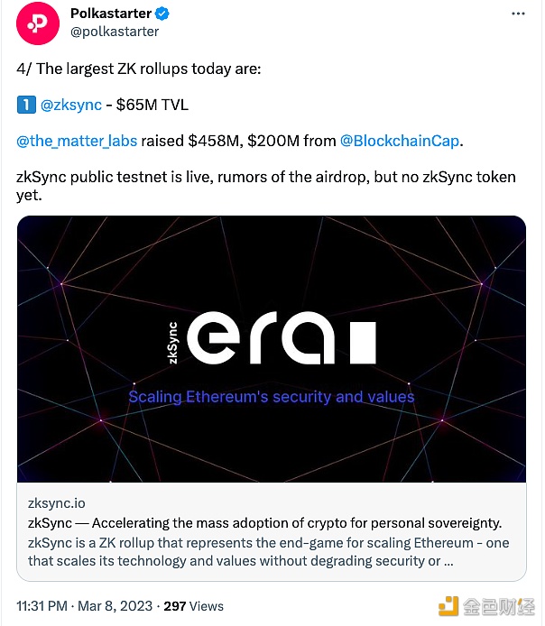 zkSync开发公司Matter Labs完成4.58亿美元融资巴适游戏网• 2025-09-26 21:15:52•链百科•阅读 675 去中心化启动平台Polkastarter在社交媒体上称,基于ZK Rollup的以太坊二层网zkSync的TVL已达6500万美元,zkSync开发公司Matter Labs完成4.58亿美元融资,Blockchain Capital领投2亿美元。此外,zkSync公共测试网已经上线,有空投的传言,但还没有zkSync代币。 标签: 美联储主席鲍威尔强调尚未就加息步伐做出决定 上一篇2025-09-26隐私搜索引擎DuckDuckGo推出AI搜索查询功能测试版DuckAssist下一篇 2025-09-26相关推荐 Pi币登录指南:图文教程,防掉队!信息化时代,别掉队!Pi币登录全攻略2025-09-26 21:15:52816 币圈新手必读:涨跌规律与入门指南币圈新手入门指南2025-09-26 21:15:52833 AGRS发行总量多少?全面解析代币分配与价值AGRS 发行总量是多少?2025-09-26 21:15:52952 Peaq币2025价格预测:DePIN潜力爆发?Peaq (PEAQ) 2025年价格预测:未来发展如何?2025-09-26 21:15:521906 牛市顶峰Q4?比特币目标12万美元!Bitfinex 预测:今年第四季度见顶?2025-09-26 21:15:52952 CHZ币瑞士发行,欧洲杯或涨CHZ币概述2025-09-26 21:15:521438 幻藏是什么?蚂蚁链NFT平台深度解析数字藏品平台:幻藏(Magic Collection)2025-09-26 21:15:52508 2025虚拟币交易所Top10:安全平台终极指南2025年最安全的十大虚拟币交易所:你的理想交易平台在哪里?2025-09-26 21:15:521912