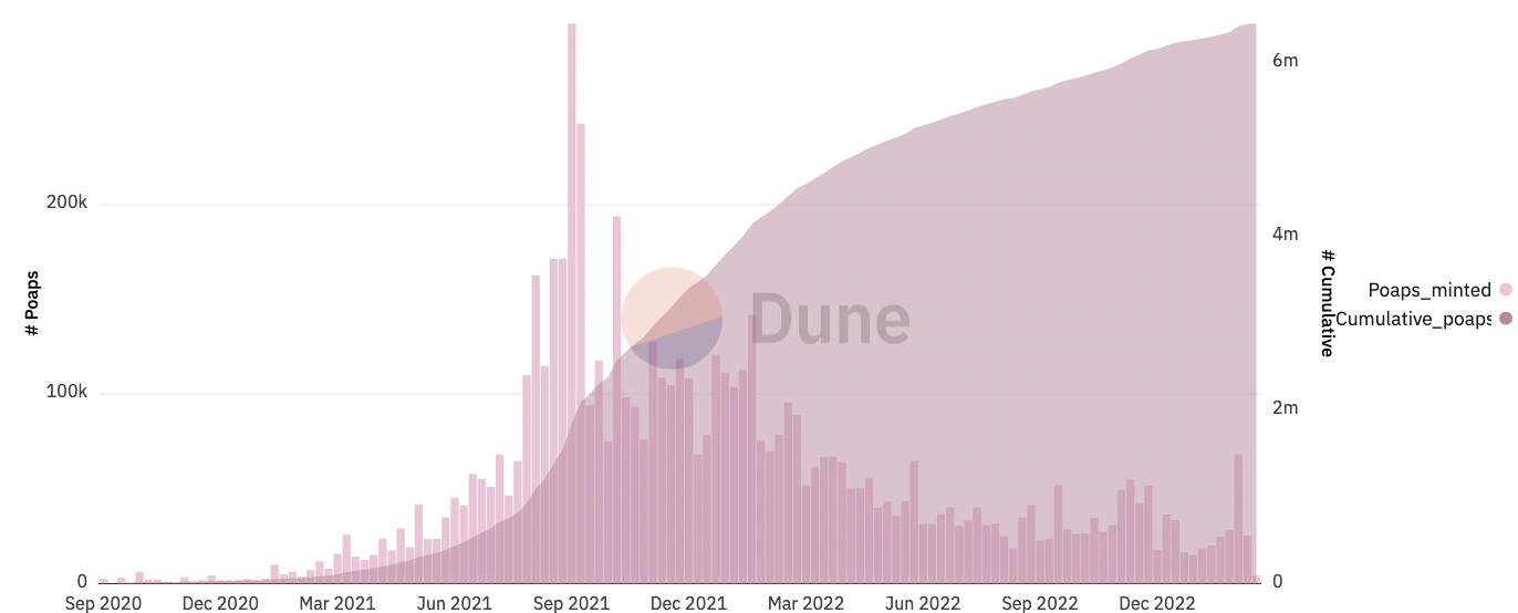 据Dune数据显示,自 2020 年 10 月以来,在 Gnosis 链(xDAI)上已经铸造了超过 640 万个 POAP。即使在过去几个月的熊市中,铸造 POAP 仍然有稳定的需求。