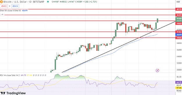 比特币(BTC)首次突破两年多来的4.5万美元,随着即将在美国批准首个现货比特币交易平台交易基金(ETF),其价格预计将进一步上涨。