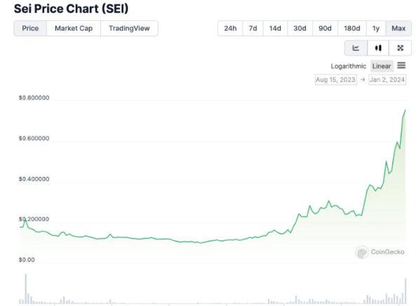 据 CoinGecko 数据,1 月 2 日,SEI 的价格较 2023 年 12 月 18 日的 0.23 美元上涨至 0.8 美元,涨幅达 230%。截至发稿时,SEI 价格回落至 0.71 美元,24 小时跌幅为 4.9%。