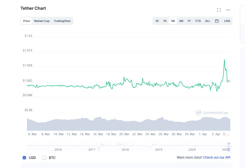 理论上,因为1:1与美元锚定,USDT的价格应该是一条水平的直线,但从上图中我们可以看出,USDT的实际表现不太稳定。