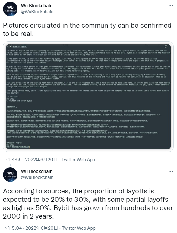 随着加密货币的暴跌遇冷,交易平台也不可避免地受到了影响。继 BlockFi 和 Crypto.com 之后,总部位于新加坡的 Bybit 也被迫裁员求生。James Wu 昨日爆料称,这家加密货币交易平台正计划削减 20~30% 的员工。而在过去两年多的时间里,其规模刚从数百人增长到了 2000 。