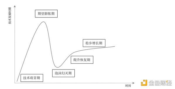 业内资深人士梁声便表示,数藏行业正在经历膨胀期后的去泡沫化阶段,行业乱象只是与行业发展相伴而生的特征之一。他用Gartner曲线解释称,产品技术从胚胎萌芽到茁壮成长分为5个阶段。数藏行业在经历了期望膨胀期后,随着泡沫的渐行渐远,整个行业的未来向好。
