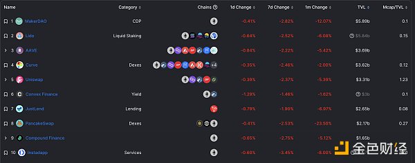 DeFi项目锁定资产前十排名及锁仓量 数据来源:defillama
