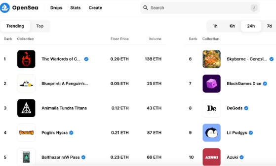 12月19日,The Warlords开放公共铸造,20分钟就全部造完。没多久,这个系列的NFT出现交易市场Opensea上,个把小时内创造了200万美元销售额,并迅速登上该市场的“24小时热门榜”的榜首。