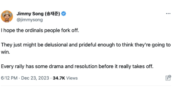 软件开发人员 Jimmy Song 于周六在 X 上发布了有关分叉的信息,随后又发布了另一篇 X 帖子,内容涉及所谓的“与 Ordinals 人员进行比特币分叉的深度激励”。