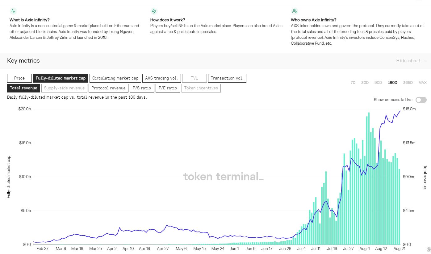 除了币价外,根据Tokenterminal数据显示,今年3月开始,Axie Infinity的日收入增速不断加快。