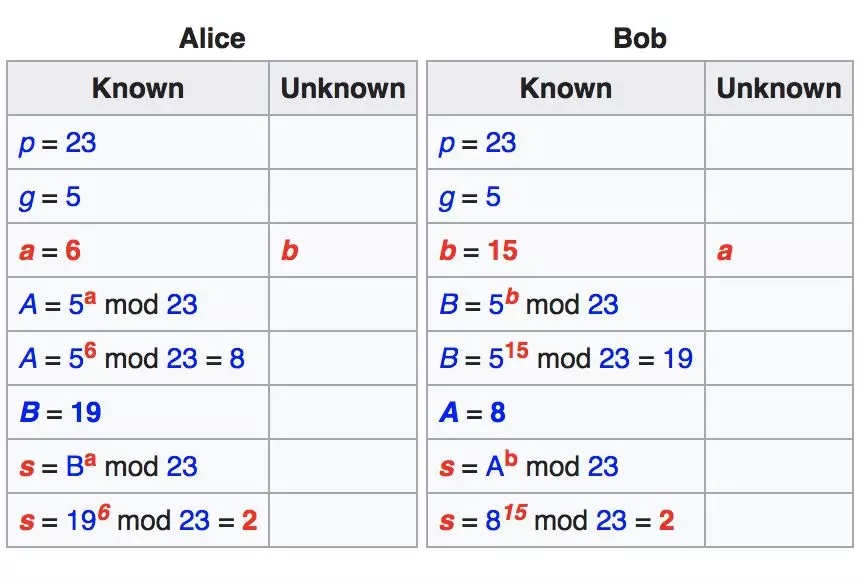 Alice 计算 g^x mod n 并告知 Bob 结果,Bob 计算 g^y mod n 并告知 Alice 结果。