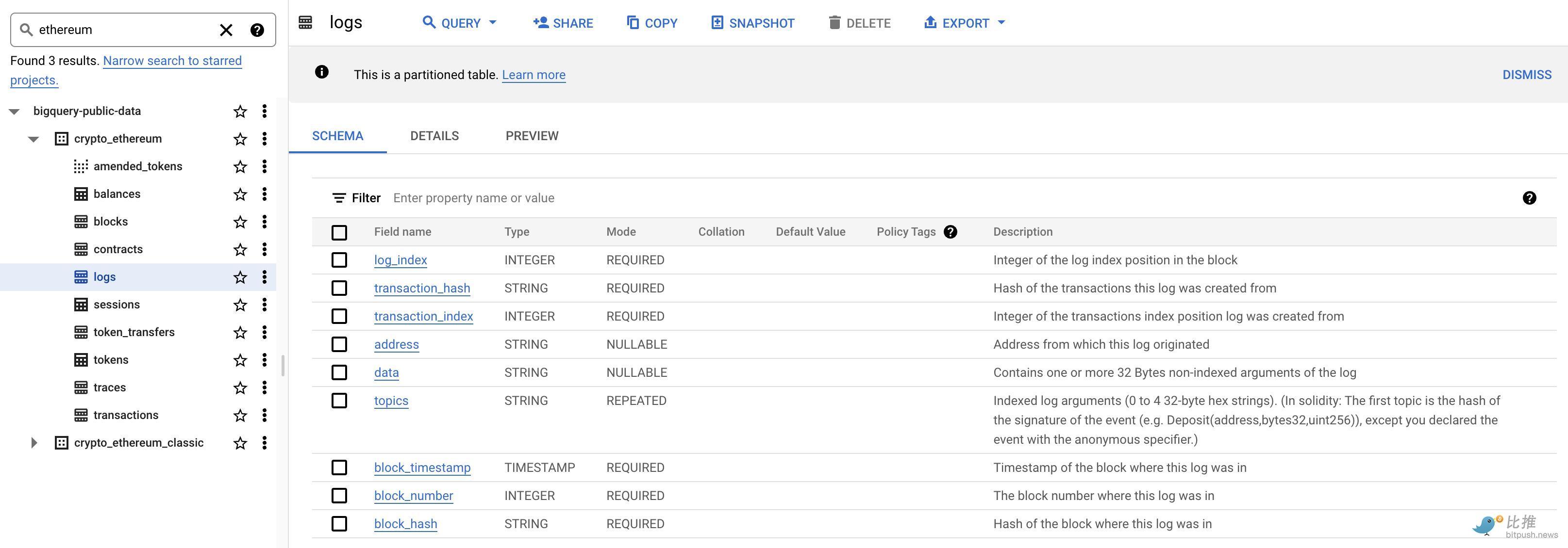 当我们从 GCP 提取表格时,我们将使用 BigQuery,它储存有很多 Ethereum 的数据表,如下图左边一栏所示。当你点击一个表格时,相应的数据库模式就会出现,就如下图中的 ethereum.logs 表。与此同时,其中涉及的地址、数据和主题都会记录到日志数据中去。