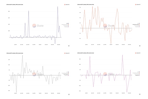Lido 的增长率一直很高,大部分时间保持增长状态,并多次有大额质押带动巨额增长。