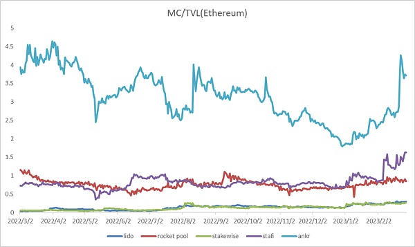 对比分析 MarketCap/TVL,可以看出年后市场对 LSD 赛道的估值明显抬升。以下几点值得注意: