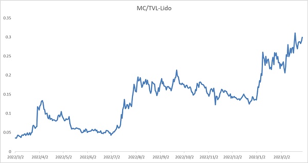 Lido 估值处于历史高位,目前在 0.2 到 0.3 之间震荡。