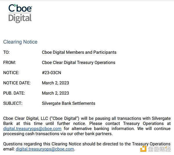 Cboe Digital 也在第一时间向其会员和参与者发布了澄清通知,将暂停与 Silvergate 的所有交易,并使用其他银行合作伙伴处理现金交易。