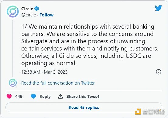 美元稳定币 USDC 发行方 Circle 在社交媒体上发文称,Circle 与多家银行合作伙伴都保持联系,目前也非常关注市场对 Silvergate 的担忧,并且正在解除与 Silvergate 的部分服务。Circle 表示相关进展会及时通知客户,当前包括 USDC 在内的所有 Circle 服务都运转正常,Circle 拥有多个储备和结算银行合作伙伴,负责管理 USDC 的现金储备,提供强大的流动性管理。
