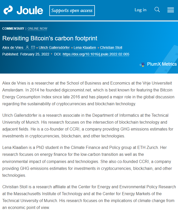 《重新审视 BTC 的碳足迹》(来自:Joule)