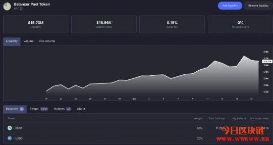 从上图可以看出,这个流动性提供池中的流动性越来越高,而流动性提供者赚取的是分散交易所中其他用户支付的费用(本例中为0.15%)。流动性提供者将把他们的PERP和USDC换成BPT(平衡器池代币),然后赚取流动性奖励。在这些分散的交易所中,所有的交易都会在区块链中被清楚地记录下来,而且不容易伪造金额(。