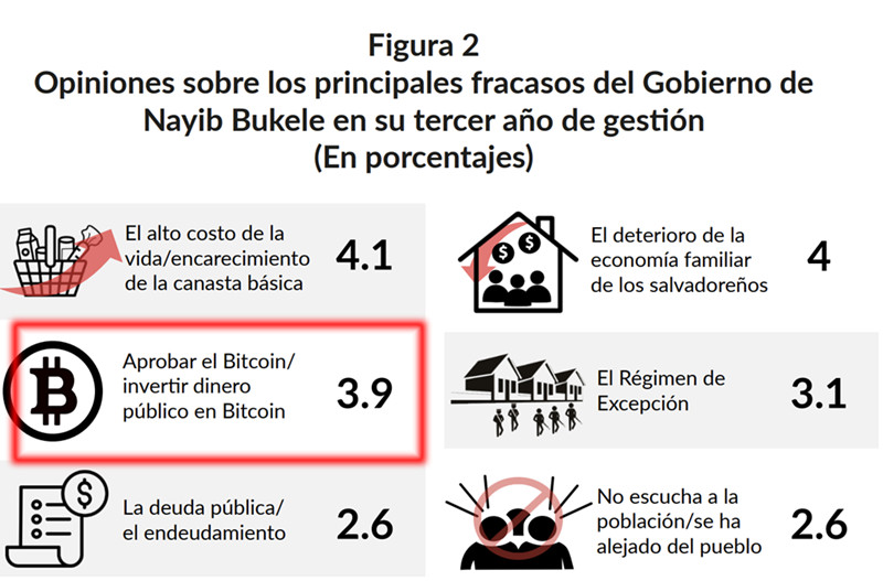 虽然大多数萨尔瓦多人根本不认为Boucle政府失败,但比特币法律的批准和Boucle购买比特币的投资在已被认定为失败的项目中排名第三,3.9%的受访者认为比特币法律是负面的。