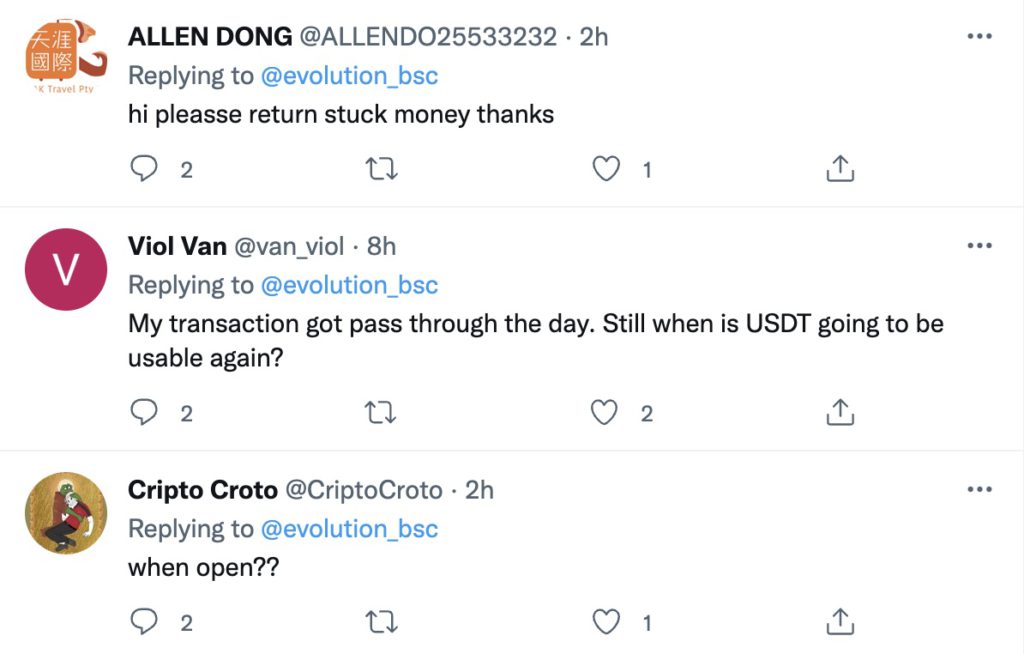 EVODefi因流动资金耗尽暂停搭桥功能后,大量用户表示自己的资金被卡了几个小时,要求项目方退钱的投诉大量涌现。