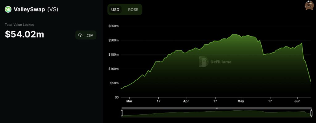 这一消息引发的FUD恐慌似乎在酝酿了一段时间后,于6月初开始发酵。DefiLlama数据显示,ValleySwap的TVL从6月3日的1.9亿美元大幅下滑,截至8月8日仅剩5402万美元,不到一周的时间跌幅超过70%。