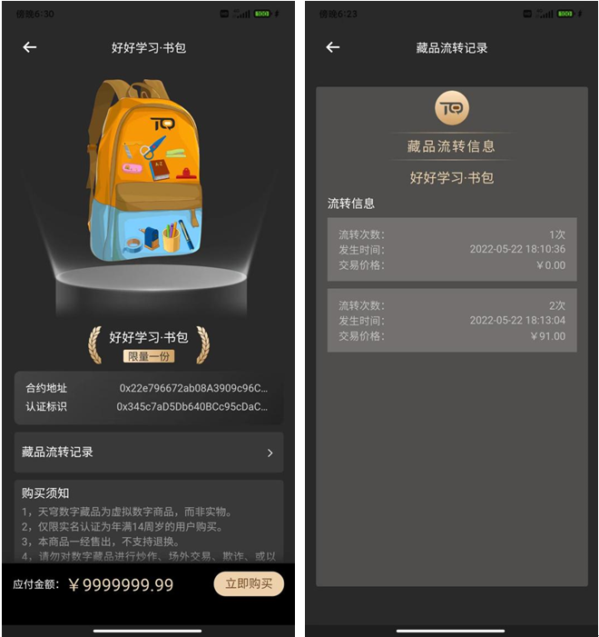 6月7日,每经记者在天空数码收藏APP的拍卖市场上,看到一个标价近千万元的“好好学习书包”收藏。流通记录显示,其5月22日的成交价仅为91元。