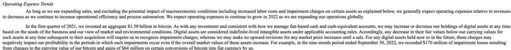 “截至2022年9月30日的九个月期间内,我们记录了1.7亿美元的减值损失,原因是比特币账面价值发生变化,而我们将某些比特币转换为法定货币获得了6400万美元的收益。”