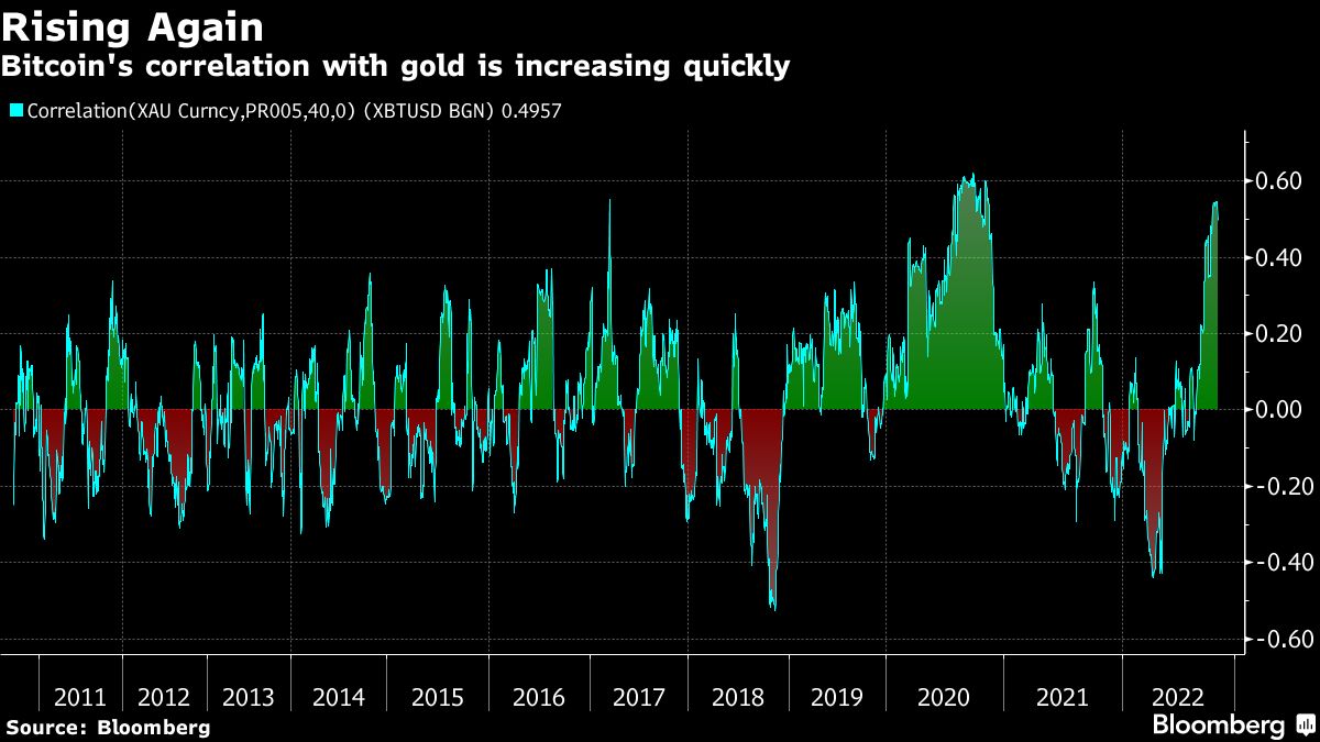 比特币和黄金的相关性在今年内大幅提高