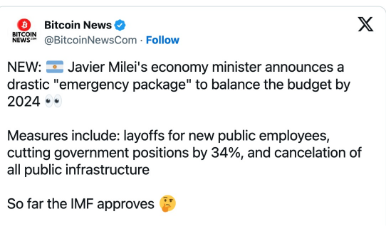对于这些国家的许多加密货币投资者来说,比特币已经成为一种可靠的价值储存手段和抗击高通胀的避风港。 尽管本国货币持续贬值,许多国家,包括尼日利亚和阿根廷,都积极拥抱加密货币。 根据 Chainalysis 9 月 12 日的一份报告,尼日利亚、土耳其和阿根廷是全球加密货币采用率第二高、第十二高和第十五高的国家。 随着亲比特币候选人 Javier Milei 在 11 月 19 日总统选举决选中获胜,阿根廷的比特币采用预计将进一步增长。 Milei 于 12 月 10 日就任后,任命 Luis Caputo 为经济部长,后者于 12 月 12 日宣布,阿根廷将比索贬值超过 50%,至每美元 800 比索,作为“紧急方案”旨在到 2024 年平衡预算。这一举措似乎得到了国际货币基金组织的认可。 国际货币基金组织称这些措施“大胆”,并补充称它们将“以保护社会最脆弱群体并加强汇率制度的方式,大幅改善公共财政”。 在竞选期间,Milei 曾表示,如果他当选总统,将废除阿根廷央行。