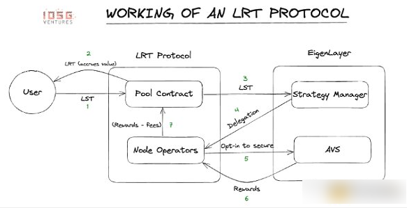 用户将他们的 LSTs/ETH 发送到流动再质押平台的资金池合同中。再质押者将获得等值的 LRT(流动性重质押代币)。然后,该合同将这些 Tokens分配给 EigenLayer 协议中的策略管理合同。策略管理合同将这些 Tokens 委托给节点运营商,并确保节点运营商坚守策略。LRT 的治理可以选择特定的策略。运营商验证底层 AVS,保留一部分奖励。其余的然后转给 LRT 协议,该协议会抽取一部分,最终将其余分配给再质押者。这明显比 LST (流动性质押代币)更具提取性,但工作量和维护要消耗更多资源。
